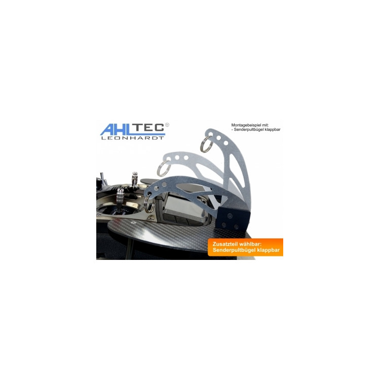 Alternativ bieten wir ihnen klappbare Senderpultbügel, welche im geklappten Zustand die Höhe des Senderpultes um 5 cm verringern.