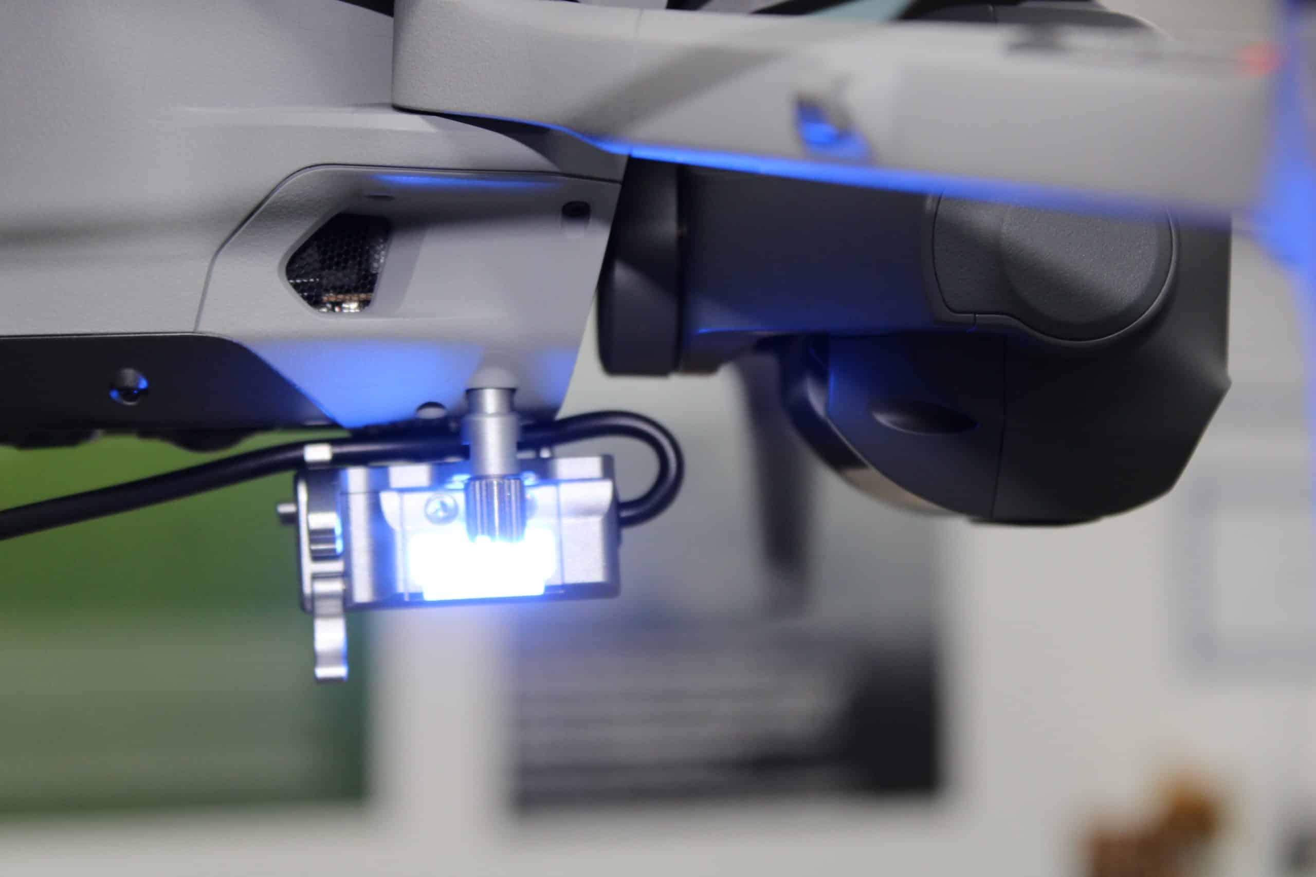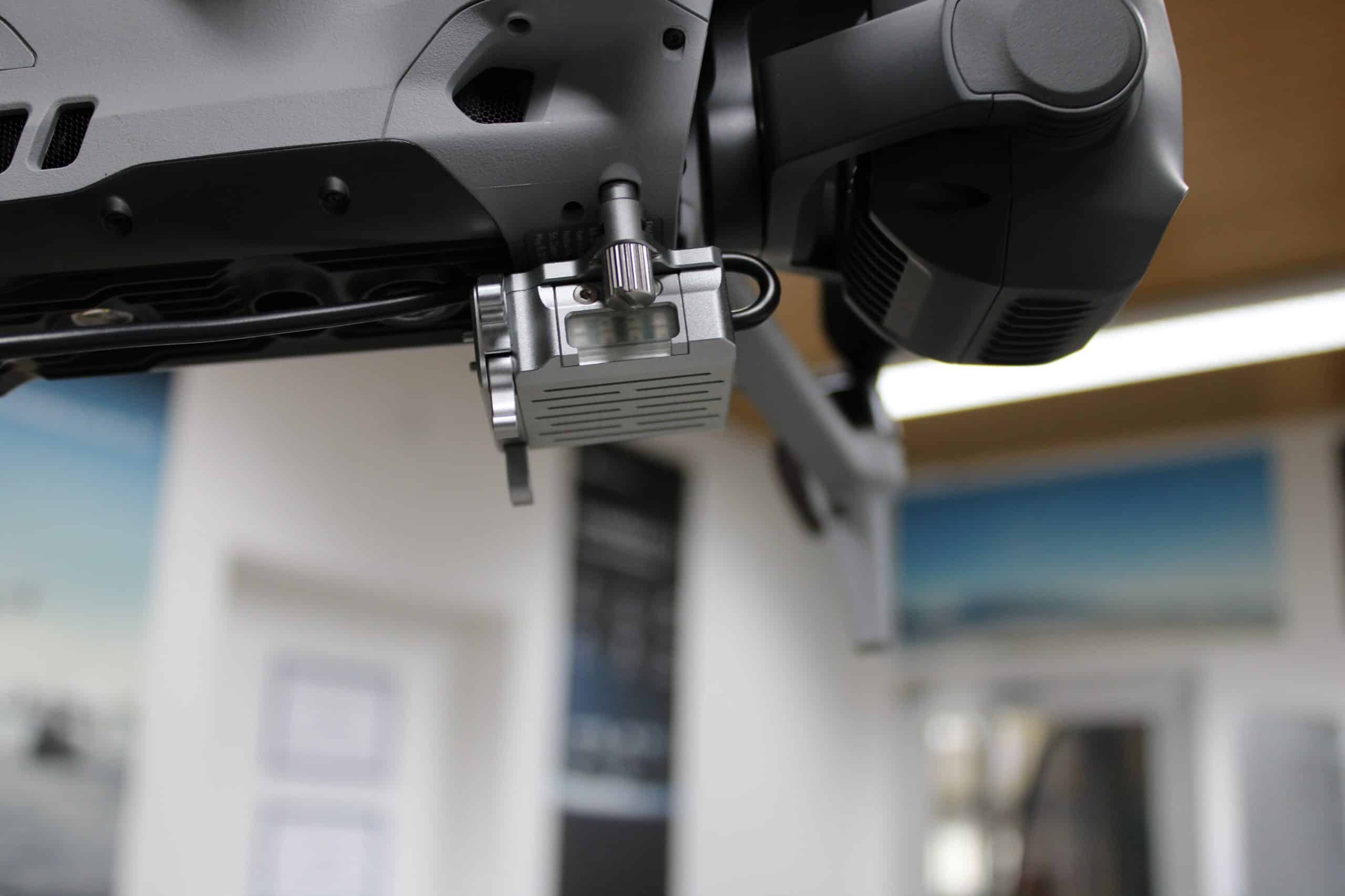 Dank des kompakten Designs ist keine bauliche Änderung an der Drohne erforderlich. Eine manuelle Einhängetaste erlaubt schnelle Handbedienung vor Ort, während die integrierte Warnleuchte mit fünf Farbmodi (abwechselnd oder synchron blinkend) für maximale Sichtbarkeit sorgt.
