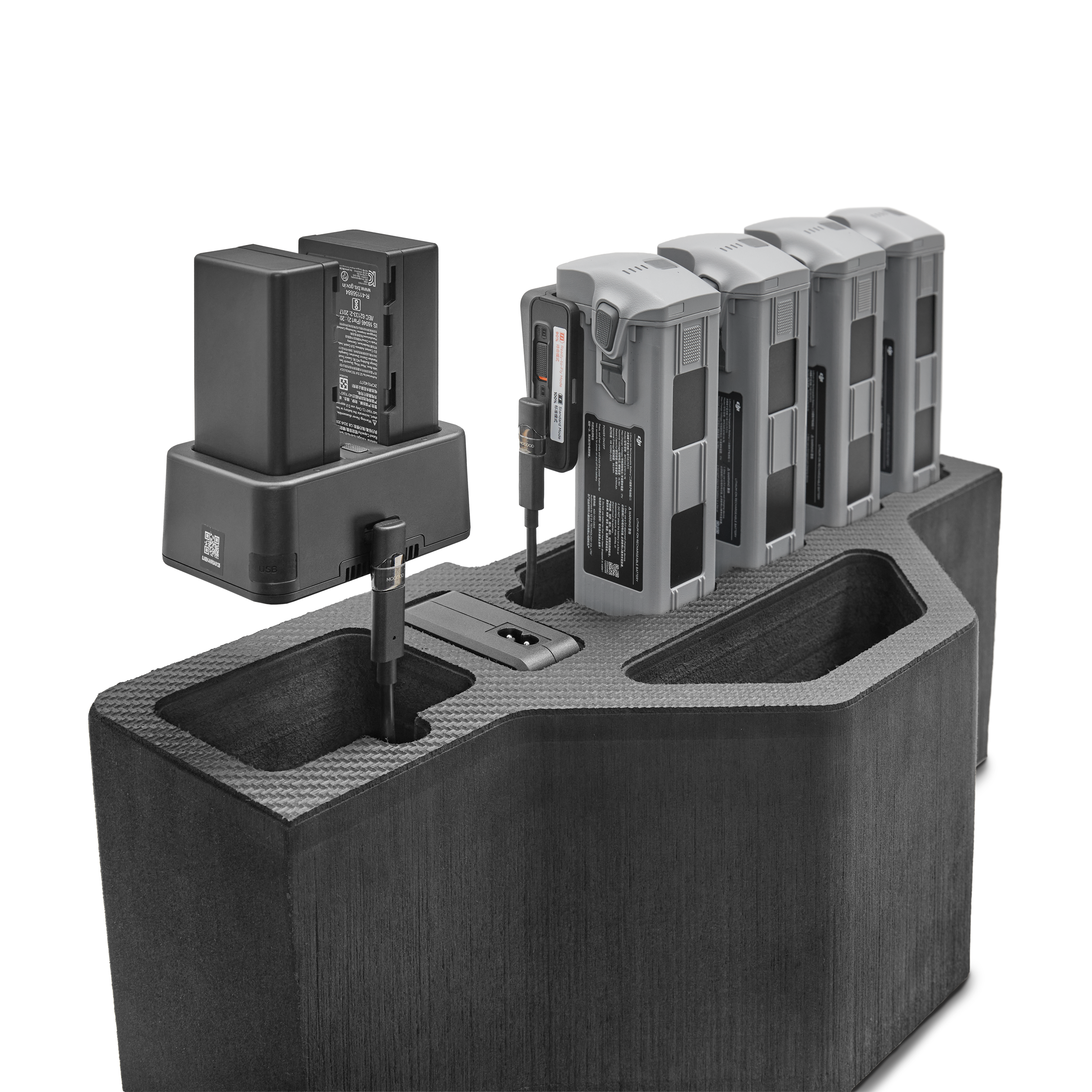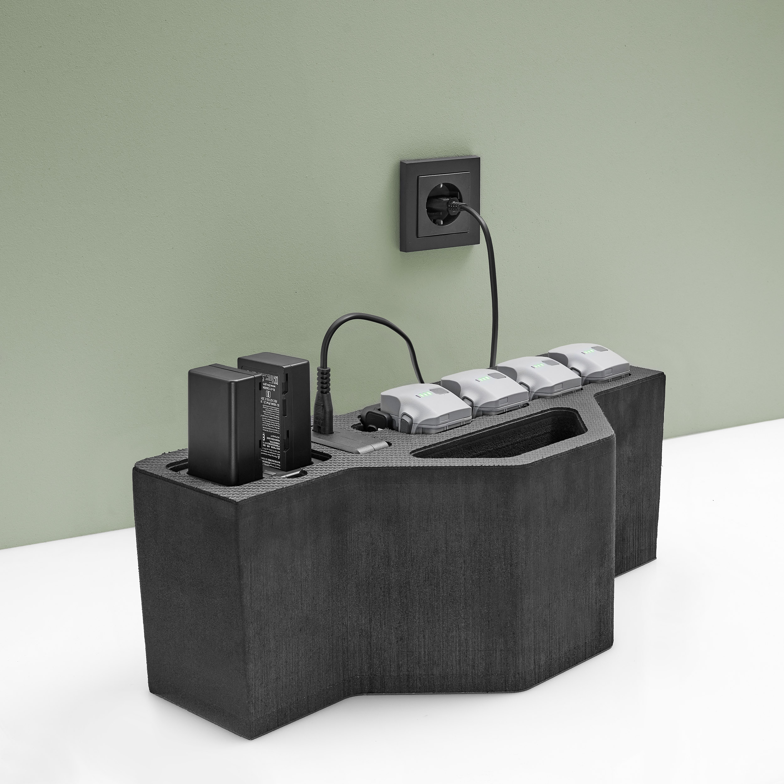 1 x Ladestation mit 4 eingesteckten Akkus inkl. Kabelmanagement für Laden im Koffer „Ready To Charge“